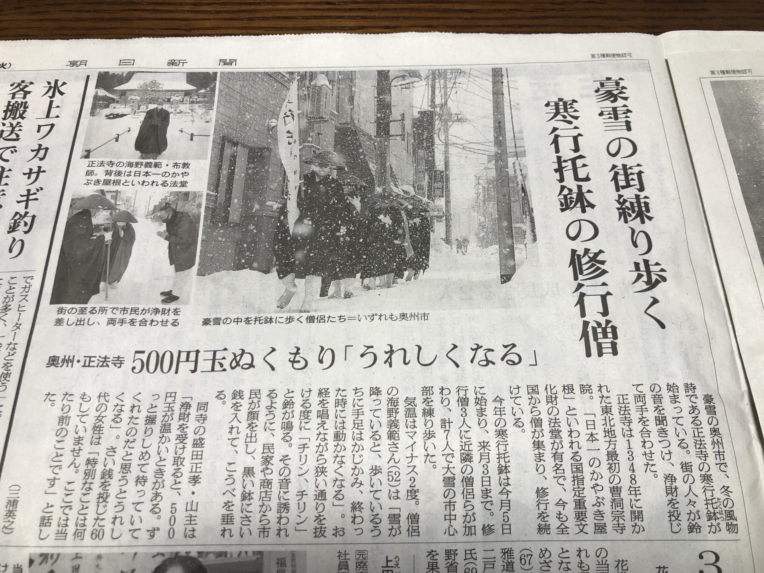 1月25日、朝日新聞と朝日新聞DIGITALに寒行托鉢の様子が掲載されました。