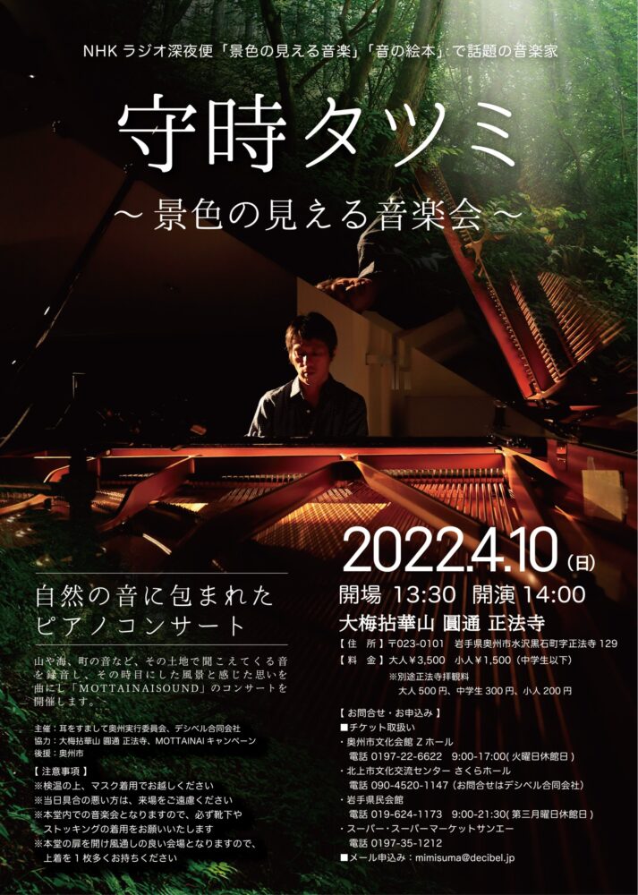 来る4月10日 午後2時より、正法寺法堂内において守時タツミ氏のピアノコンサート「景色の見える音楽会」が開催されます。