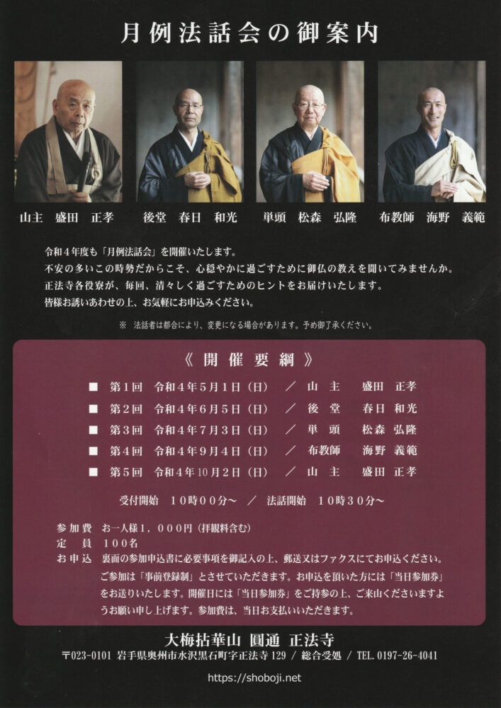 昨年、多くの御拝聴をいただきました正法寺月例法話会を本年度も開催いたします。