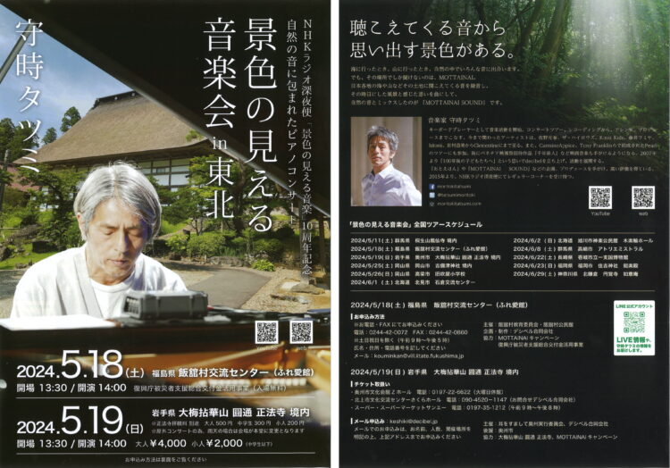 今年もNHKラジオ深夜便「景色の見える音楽」「音の絵本」で話題の音楽家、守時タツミさんのピアノコンサートを正法寺にて開催することになりました。皆様お誘いあわせの上、お出掛けくださいますようお願い申し上げます。