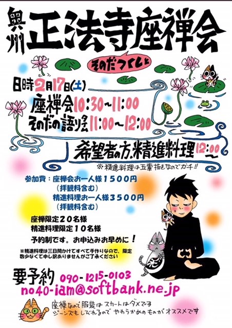 その作者である、そのだつくしさんと一緒に正法寺で坐禪会を行います。暖かい御召物にてご参加下さい。