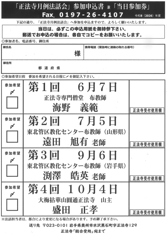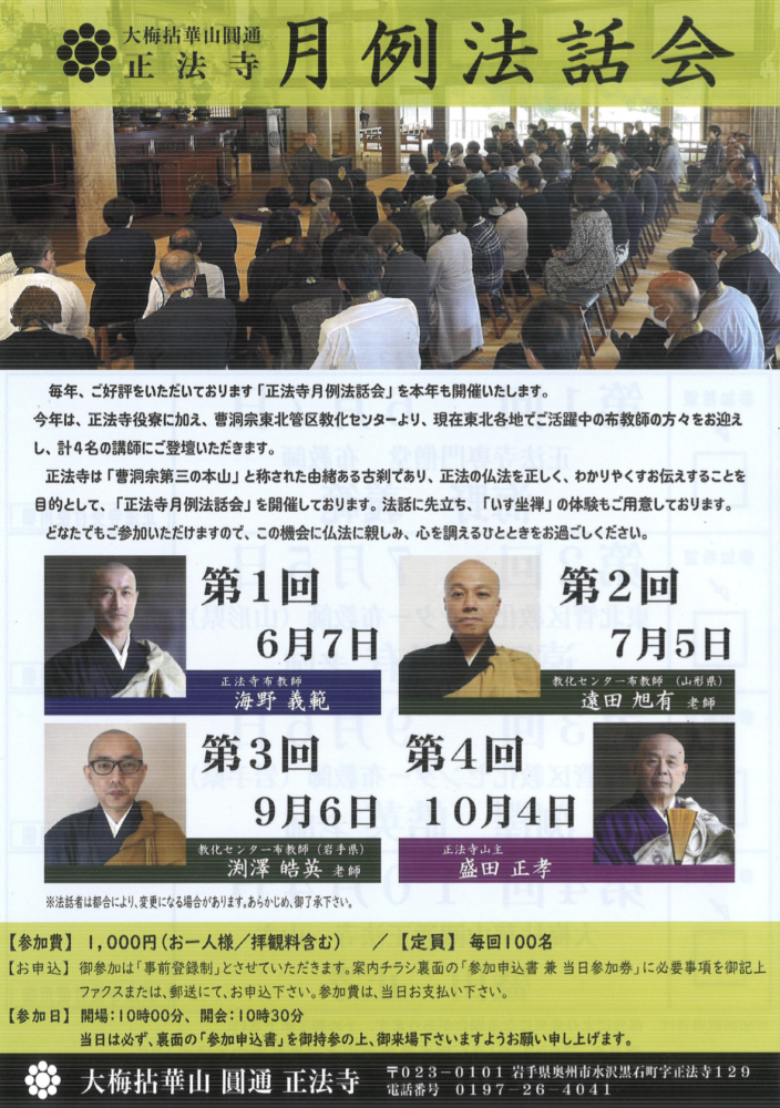 今年は、正法寺役寮に加え、曹洞宗東北管区教化センターより、現在東北各地でご活躍中の布教師の方々をお迎えし、計4名の講師にご登壇いただきます。